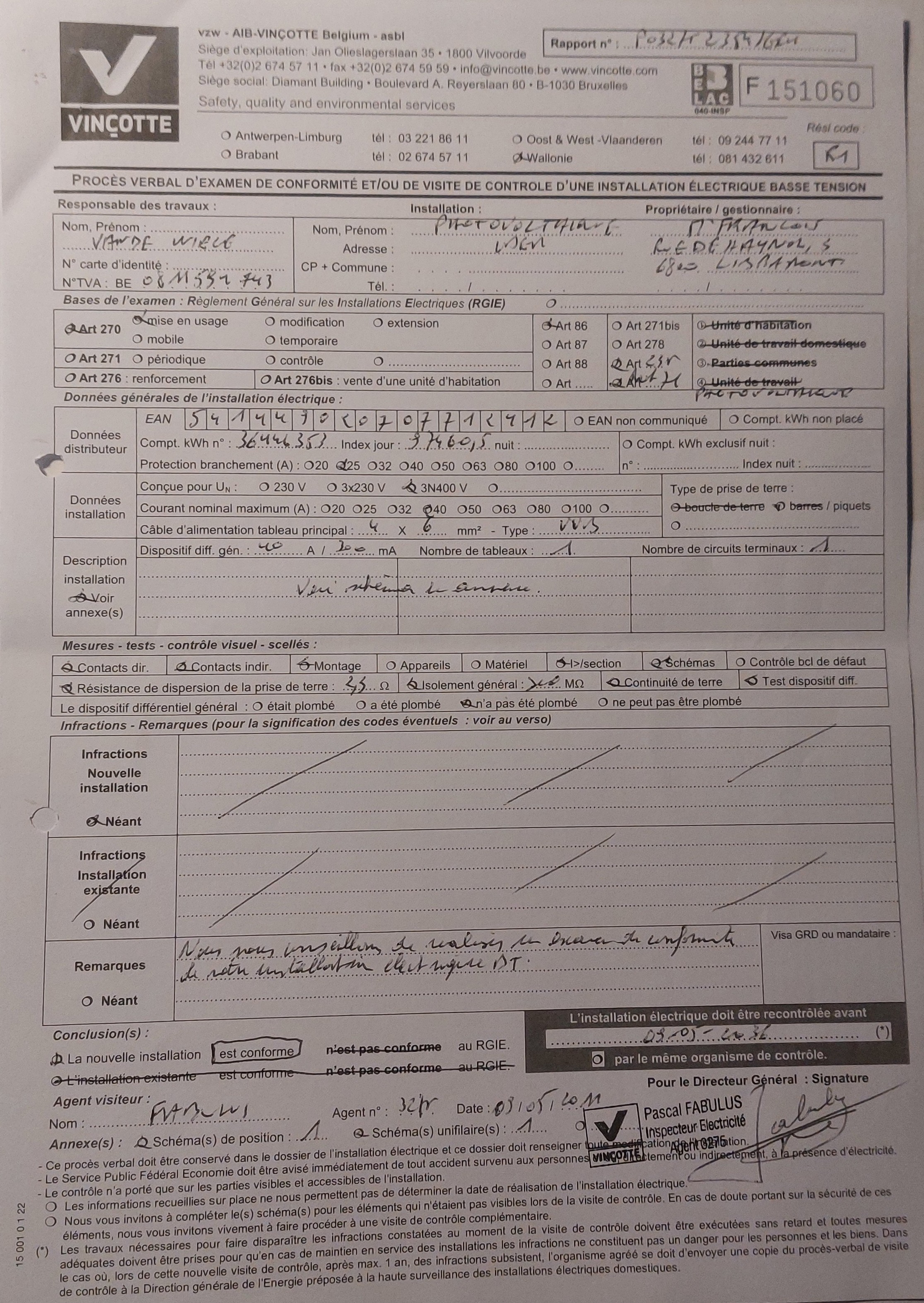 Certificaat elektriciteitJa, niet conform AREI
